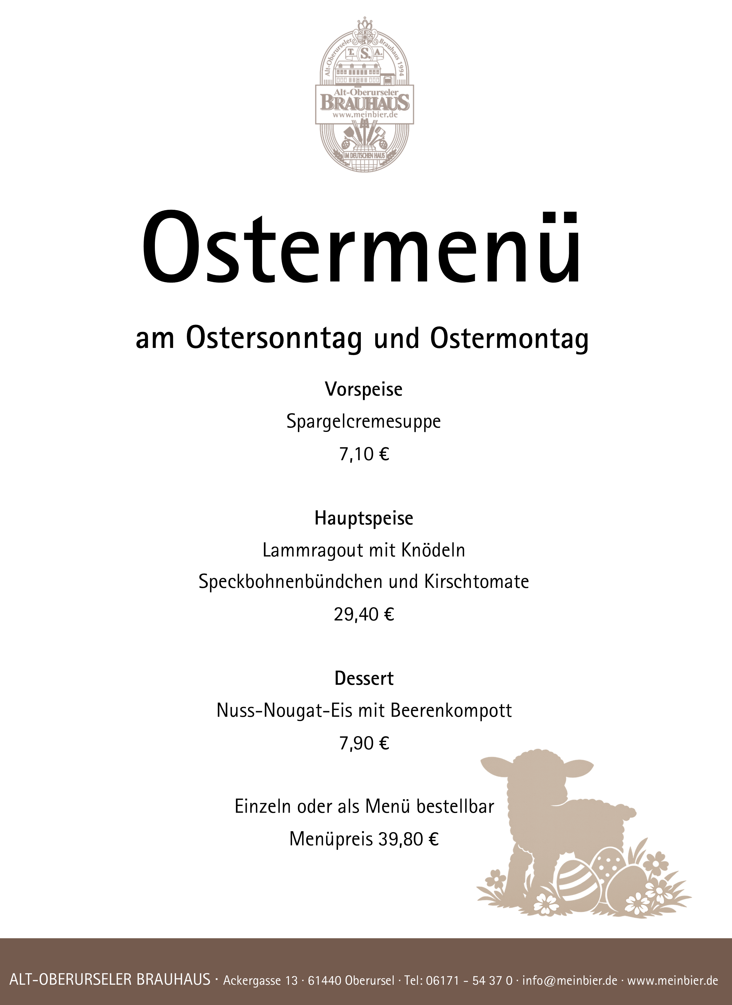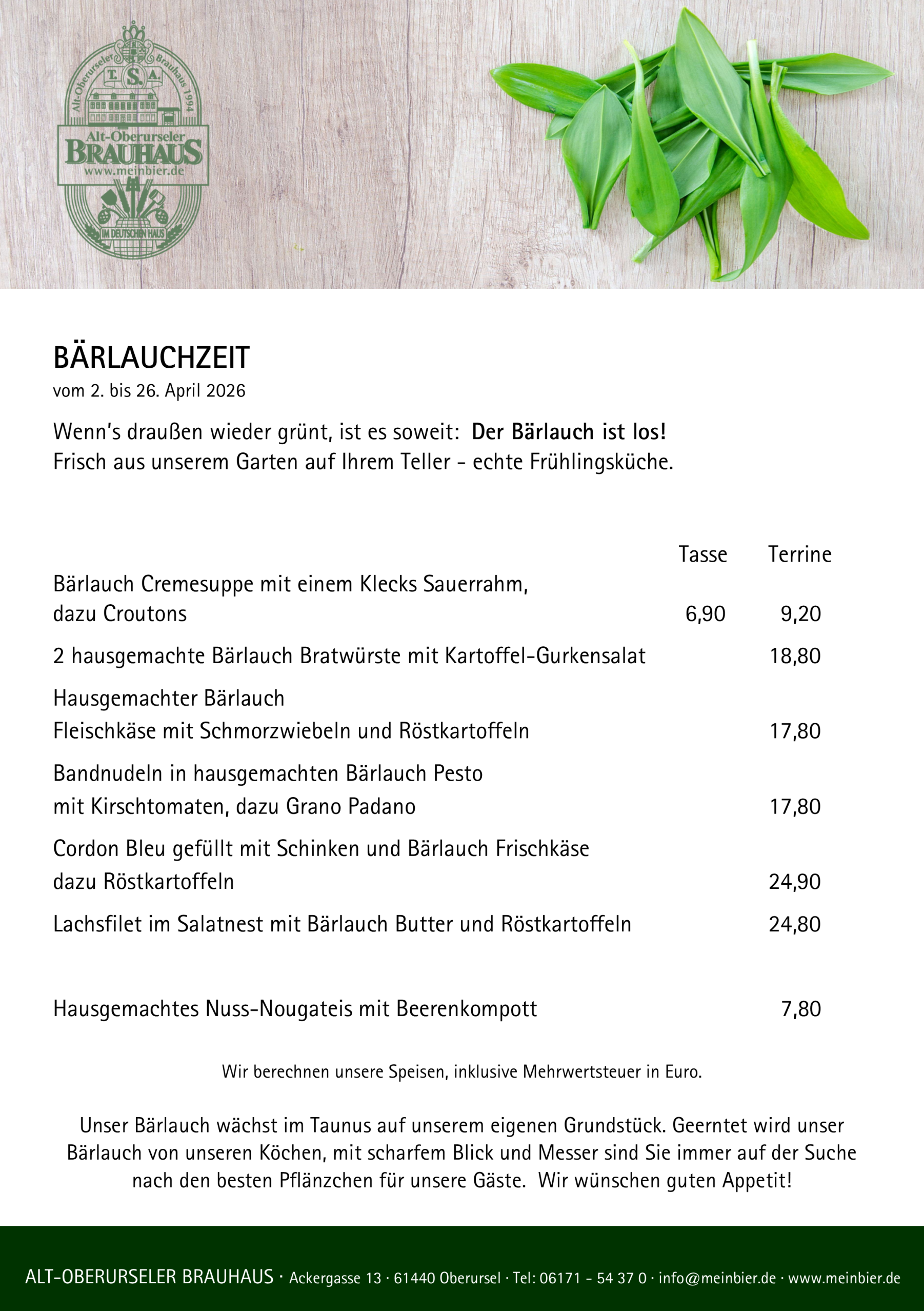 Neben einem rustikalen Menü – dem Brauermahl – beinhaltet das Seminar das Eindecken der Tische, eine Getränkepauschale inklusive des selbstgebrauten Bier, Wein und alkoholfreie Getränke (ausgenommen sind Spirituosen, Sekt und Heißgetränke), Brauereiführung, Teilnehmerurkunde und Skript zur Bierzubereitung für jeden Teilnehmer runden das ganze Paket noch ab. Preis auf Anfrage. Mindestteilnehmerzahl 25 Personen.